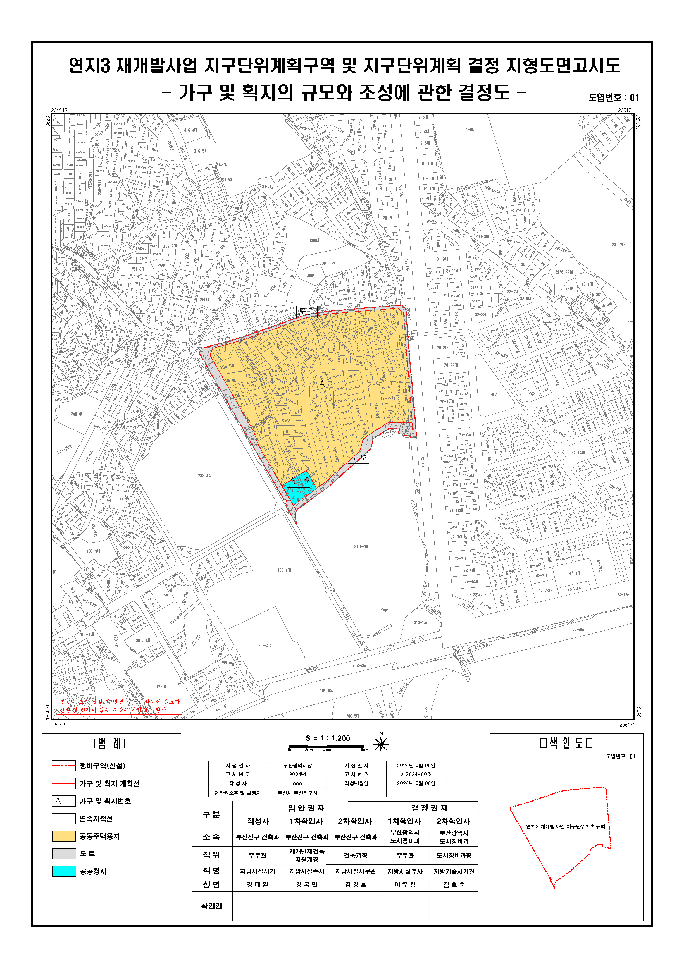 1. 부산광역시 부산진구 연지동 273-1번지 일원의 연지3 재개발 정비구역에 대하여 「도시 및 주거환경정비법」 제16조 규정에 따라 다음과 같이 정비계획 결정 및 정비구역 지정을 고시하며, 「토지이용규제 기본법」 제8조 및 같은 법 시행령 제7조 규정에 따라 지형도면을 고시합니다. 2. 관계도서(토지이음“http://www.eum.go.kr”에서 열람 가능)는 부산광역시 도시정비과(☏ 051-888-4234) 및 부산진구 건축과(☏ 051-605-8582)에 비치하여 일반인에게 보입니다.